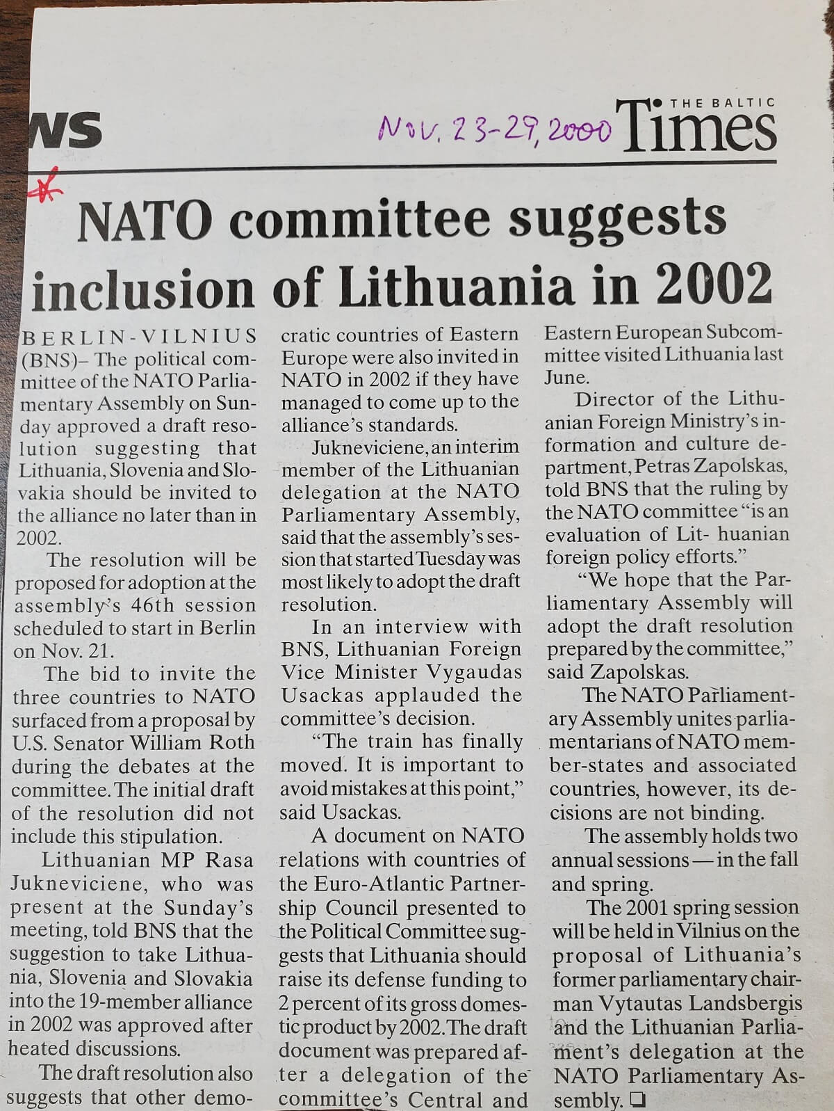 On October 24, in an article, Zbigniew Brzezinski stated “that Lithuania and Slovenia should be seriously considered as candidates for NATO admission in the next round of NATO admissions. He stated “that while Lithuania has managed to fulfill requirements for such admission, at the same time Latvia and Estonia have not.”