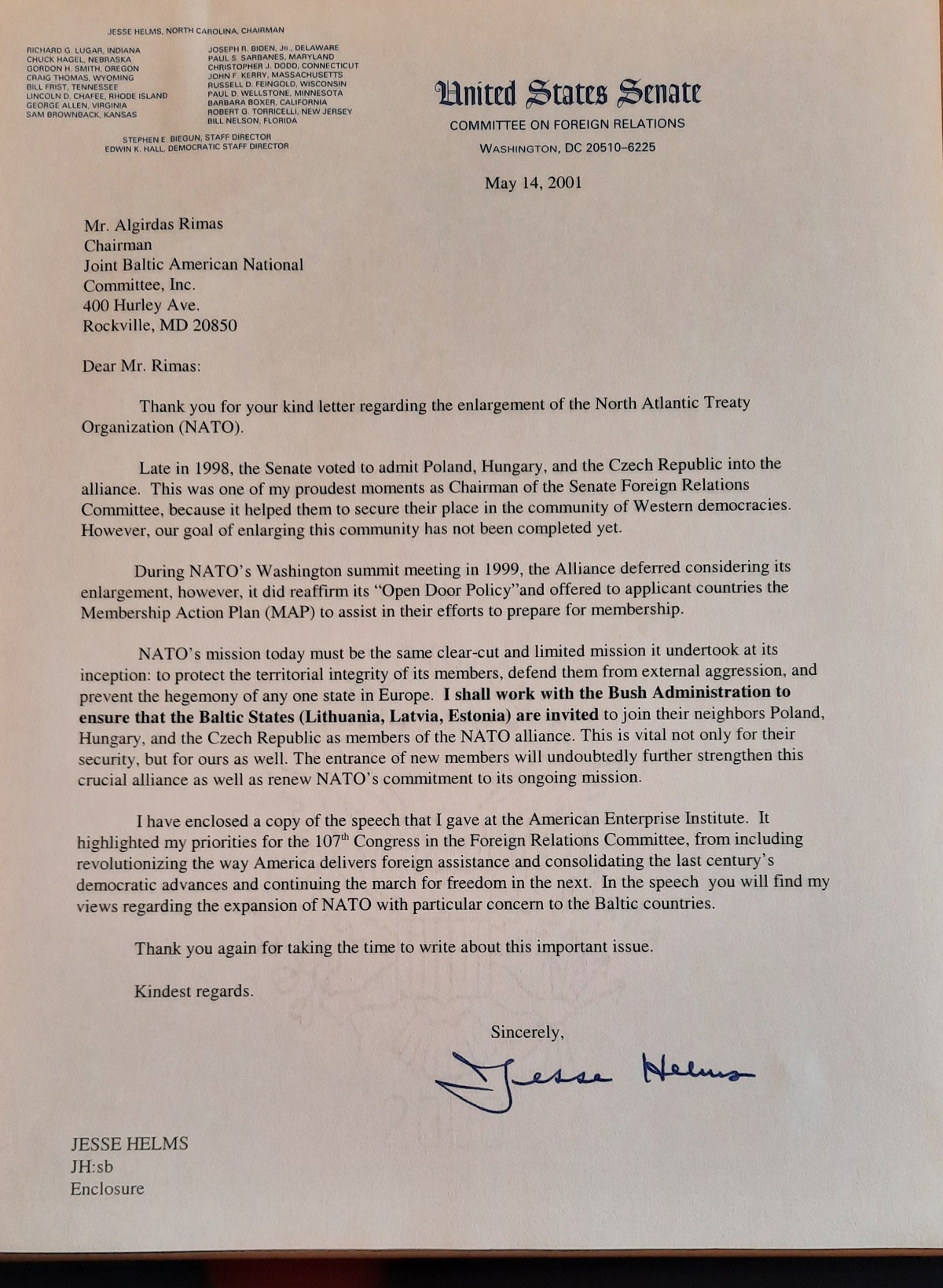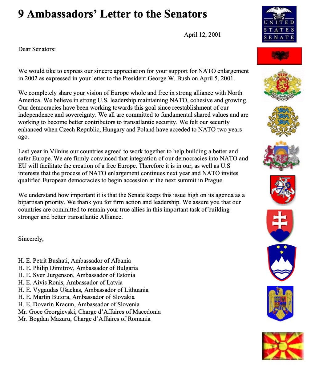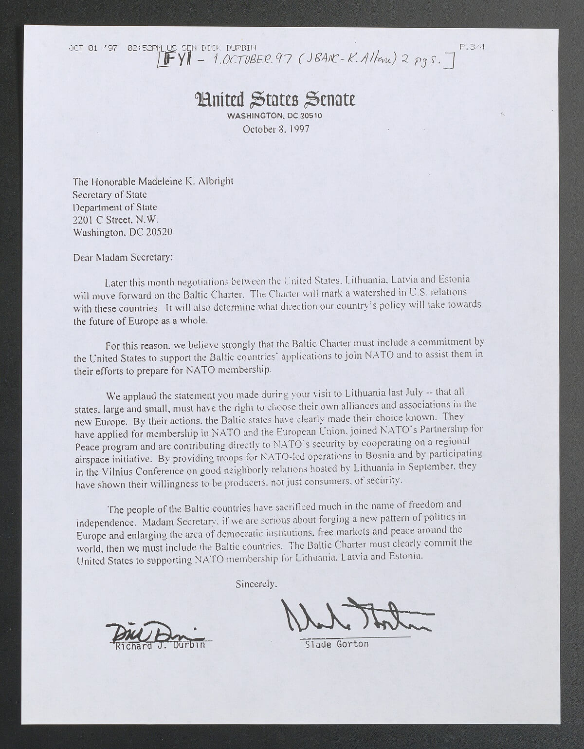 On June 8, in a letter to President Bush before his trip to Brussels, six senators - Durbin, George V. Voinovich (R-OH), Barbara A. Mikulski (D-MD), Helms, Gordon Smith (R-OR) & George Allen (R-VA) urged him "...to include Lithuania, Latvia, and Estonia and other nations that are ready and prepared to assume the responsibilities of membership” in the next phase of NATO enlargement."