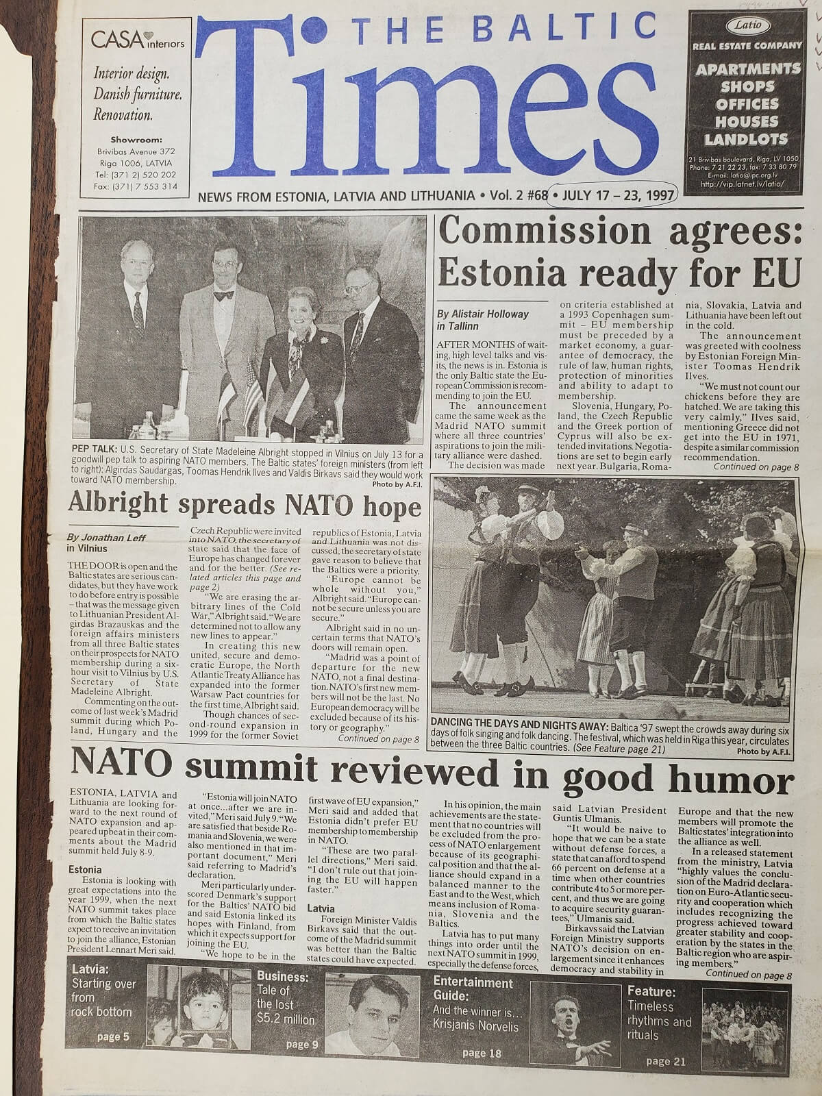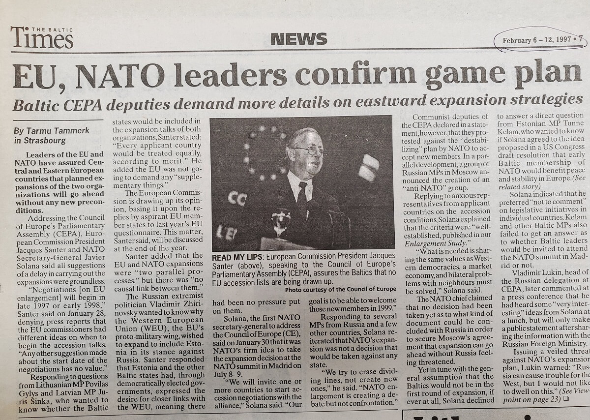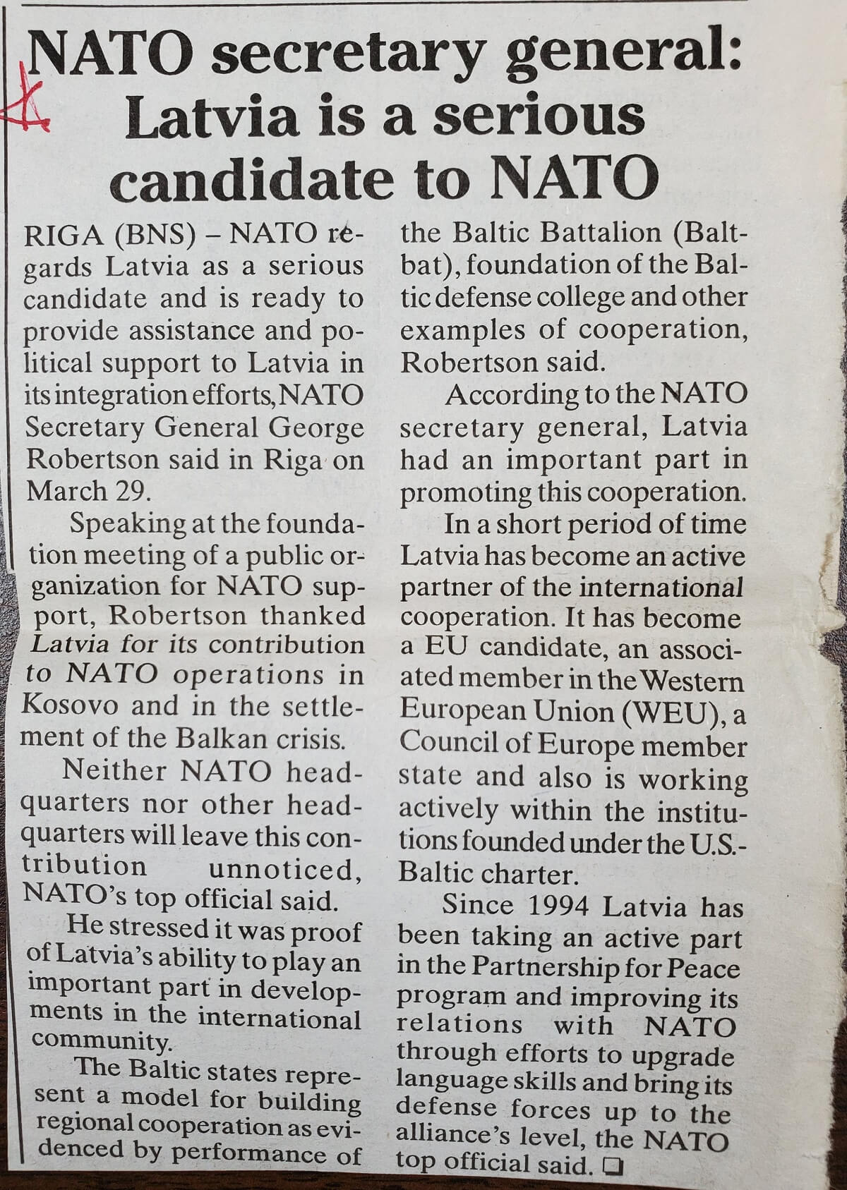 On April 17, NATO Secretary-General Javier Solana ended his Baltics visit in Riga by stating at a press conference that NATO membership was still possible for all three Baltic nations, but did not answer questions regarding what type of, if any, protection would be offered to countries left out of NATO…. President Lennart Meri stated that if NATO expansion comes at the expense of the security of other countries, then it follows that NATO will not be fulfilling its purpose.