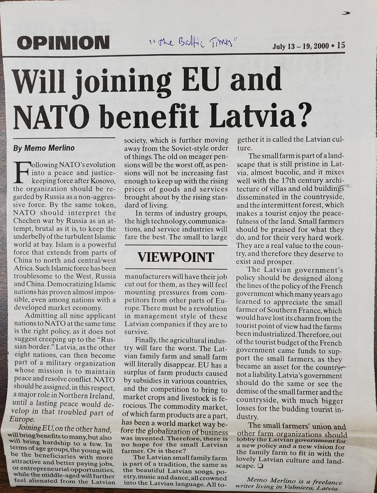 On March 20, the Minnesota Legislature adopted resolutions supporting the admission of the Baltics to NATO. An American-Latvian constituent from Minnesota, Lia Ozols, was the driving force behind passing the resolutions.