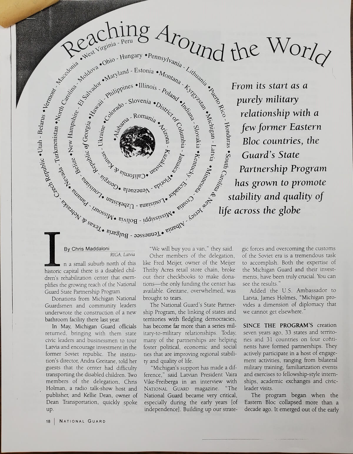 The National Guard State Partnerships were well-established by this time and making an impact beyond just military exchanges. The relationships had evolved into programs that forged ties between civic leaders and business interests, and fostered political, economic and social connections that contributed to stability on many levels. Latvian President Vaira Vike-Freiberga praised the Michigan National Guard partnership with Latvia for helping the nation overcome lingering Soviet era influences. She told National Guard Magazine that, "Both the expertise of the Michigan National Guard and their investments have been truly crucial. You can see the results." U.S. Ambassador to Latvia, James Holmes added that the program provided "a dimension of diplomacy that we cannot get elsewhere." (Photo 8-25 NG mag)