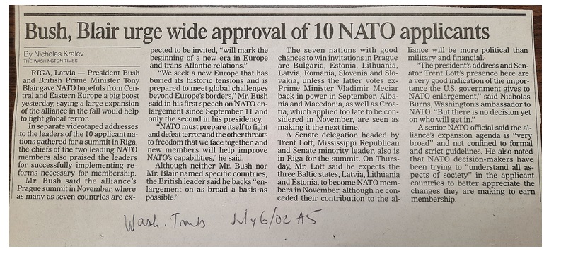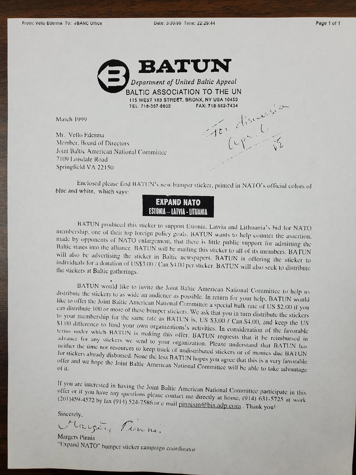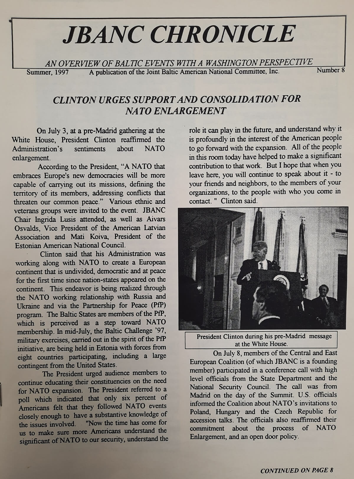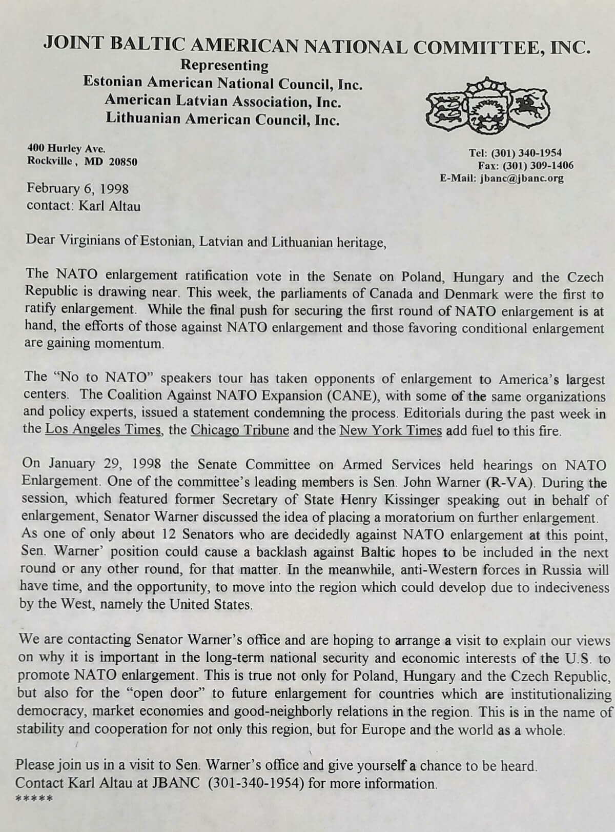 During December, American Latvian Association urged their members to contact their representatives, Senators & the US Administration about including the Baltics in NATO enlargement.