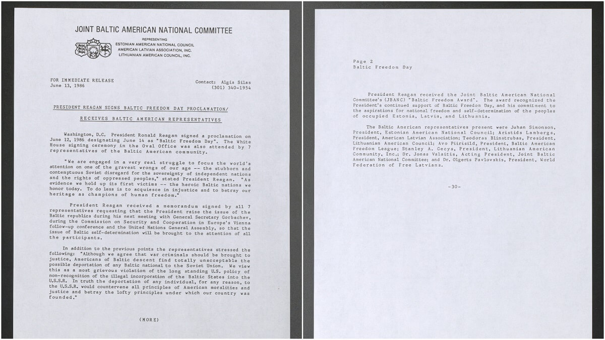 Some of the examples of the advocacy efforts between the 1950s and 1990, include regular communication with the U.S. administration and members of the U.S. Congress and Senate, giving out Baltic Freedom awards, organizing protests and raising awareness in the U.S. media. One of the symbolic highlights during this period was the proclamation of June 14 as the Baltic Freedom Day by President Ronald Reagan in 1986. A pivotal turning point in the Baltic fight for freedom was the peaceful Baltic Way demonstration on August 23, 1989, which received a widespread international recognition.