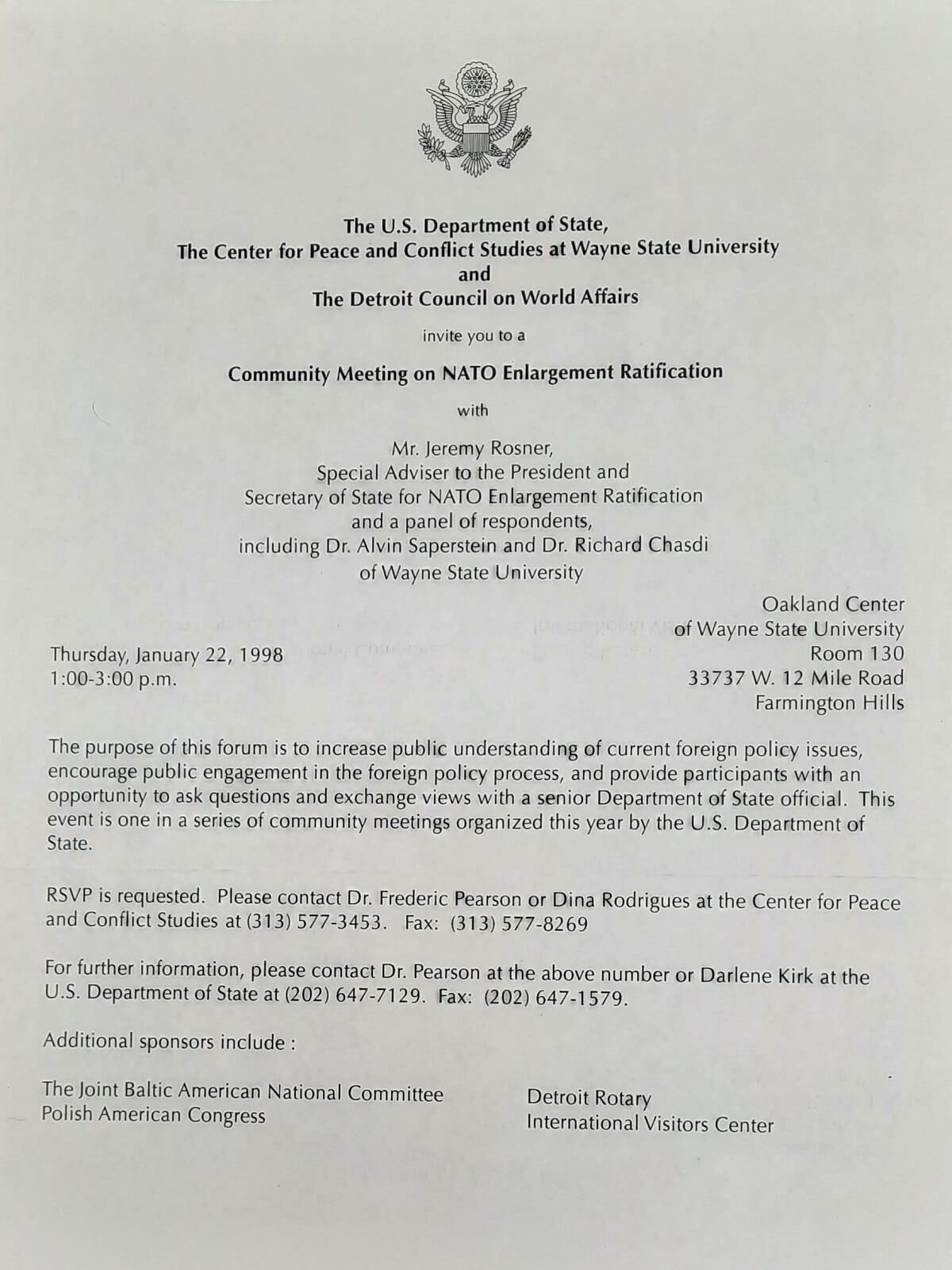 On February 21, Senate of Michigan adopted Senate Concurrent Resolution No. 6, introduced by Sen. Thaddeus McCotter, calling for support of the addition of Estonia, Latvia, Lithuania into NATO. It was adopted on March 6, 2002.