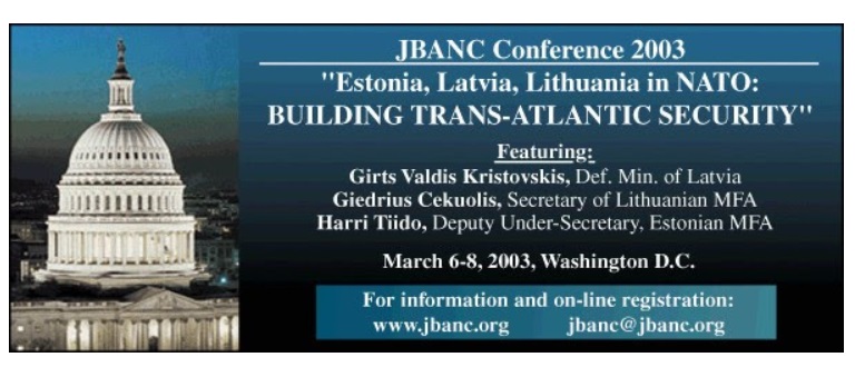 On March 6-8, 2003, JBANC held its Fifth Conference on Baltic Security in DC. The main message of the conference was clear - no obstacles were seen to impede the enlargement of NATO to include Estonia, Latvia, and Lithuania. This message was also evident from the statements of high-ranking officials from the Baltic countries who participated at the conference.