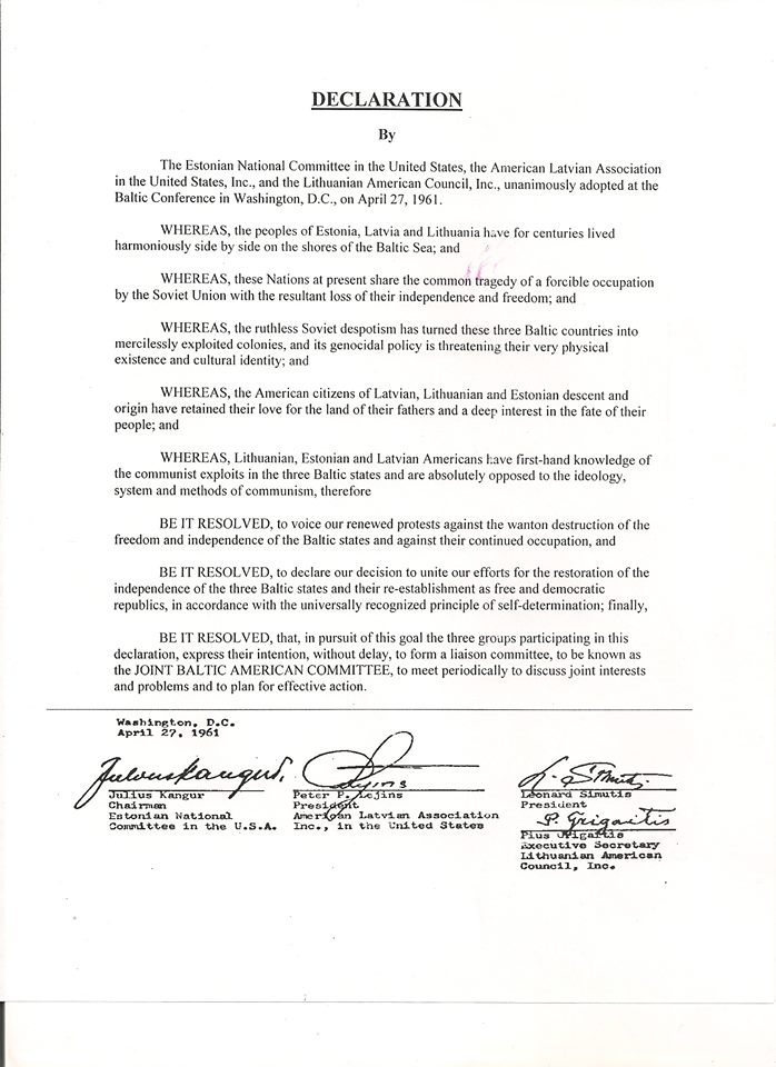 One of the milestones was establishment of the Joint Baltic American National Committee (JBANC) in 1961 by its three parent organizations, the American Latvian Association, the Estonian American National Council, and the Lithuanian American Council. It allowed them to better coordinate the common efforts, and after regaining independence, one of the most important goals was to work towards NATO membership for Estonia, Latvia and Lithuania.