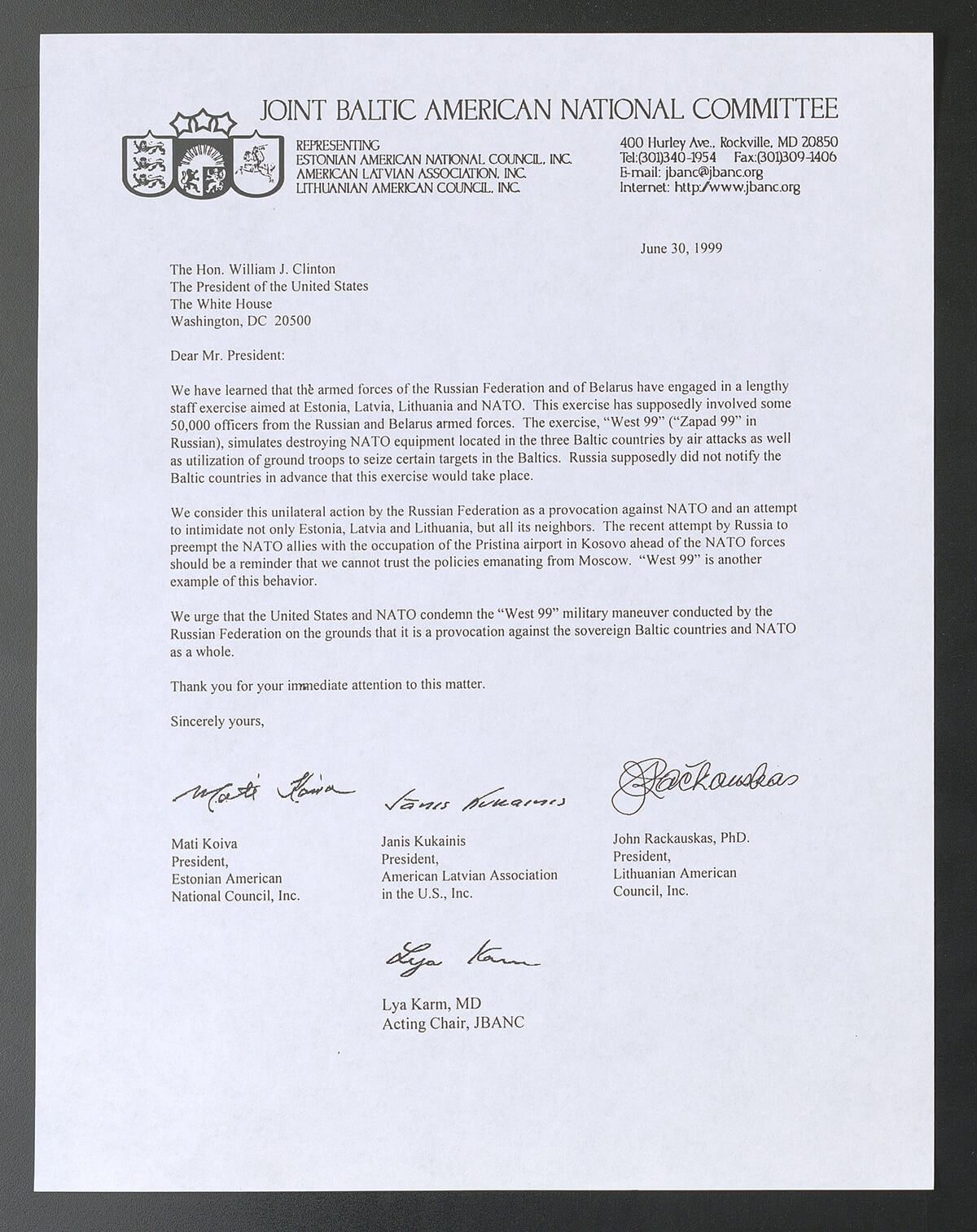 The exhibit features a timeline of key dates and events that led to the Baltic inclusion into NATO in 2004, exploring a variety of decisions made by the Baltic and the U.S. governments. It also provides an in-depth look at the role of civil society and Baltic-American organizations such as JBANC, and how they played a vital part in the process of enlargement.