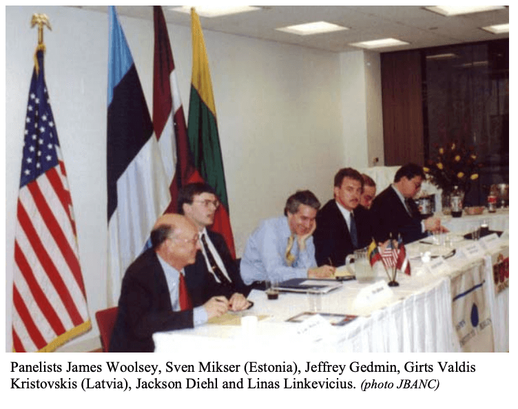 On March 13, 2002, JBANC and Aspen Institute-Berlin cosponsored a conference at the Hart Senate Office Building in Washington, D.C. with visiting Baltic Defense Ministers. They included Sven Mikser of Estonia, Girts Valdis Kristovskis of Latvia and Linas Linkevicius of Lithuania. Attended by standing room-only special invitees, the conference consisted of a panel of the Defense Ministers, former CIA Director James Woolsey and Washington Post reporter Jackson Diehl. The main thread running through the Defense Ministers' remarks was Baltic preparedness for NATO membership and current and increasing military cooperation among them. All said they were ready for NATO. The ministers often echoed each other's remarks, saying that Baltic membership will be driven by values and not by fear. They suggested that Russia will adapt to Baltics in NATO very quickly. Former CIA Director Woolsey was strongly optimistic about the Baltics getting invitations to join NATO during the Prague Summit this November. Washington Post reporter Diehl, while not denying the possibility of Baltic membership, said that the process is not yet over, especially because NATO needs to define its own future. - Vello Ederma