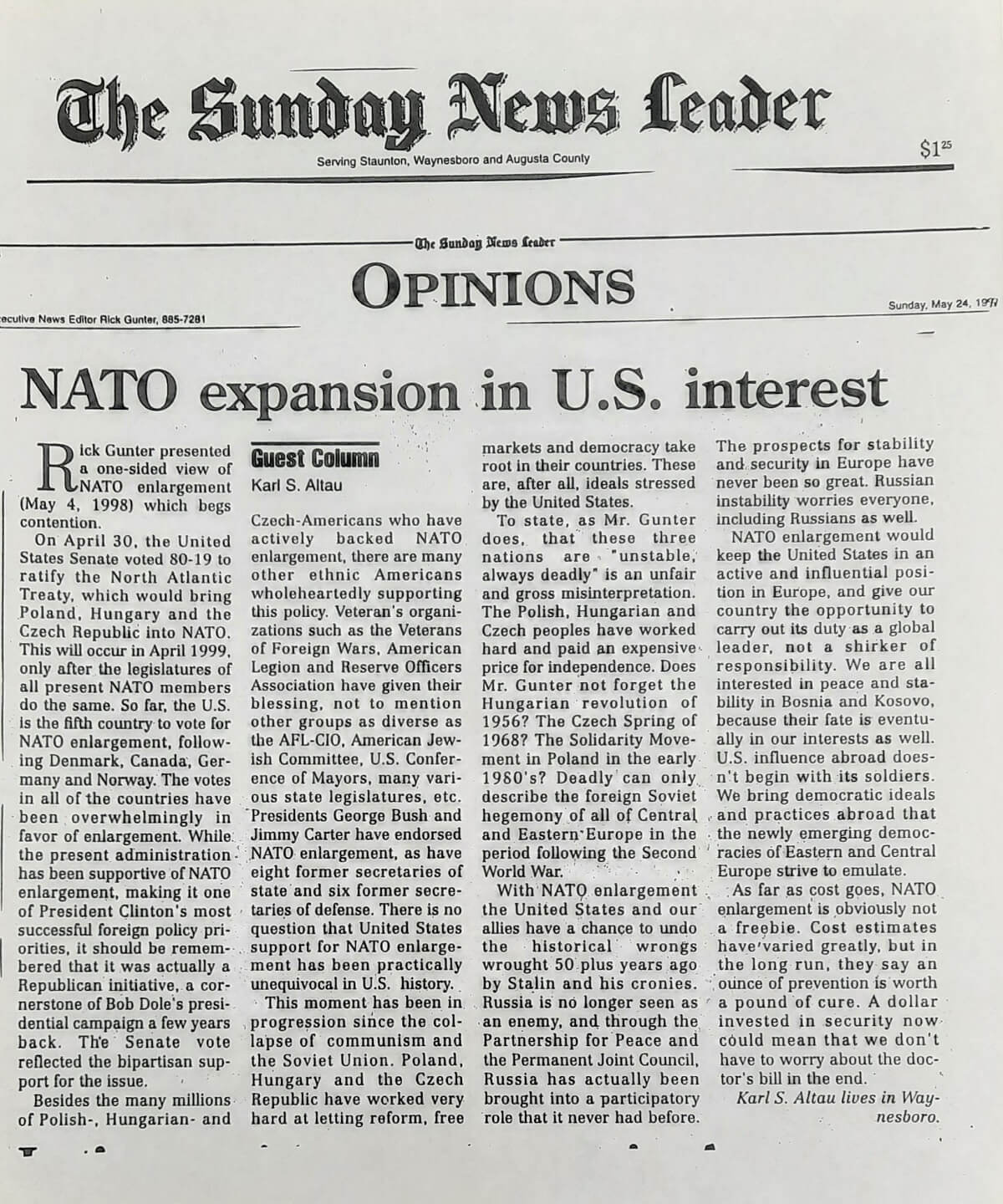 On October 9, Former National Security Advisor Zbigniew Brzezinski stated “NATO expansion is central to the vitality of the American European connection, to the scope of a democratic and secure Europe, and to the ability of America and Europe to work together in promoting international security.”