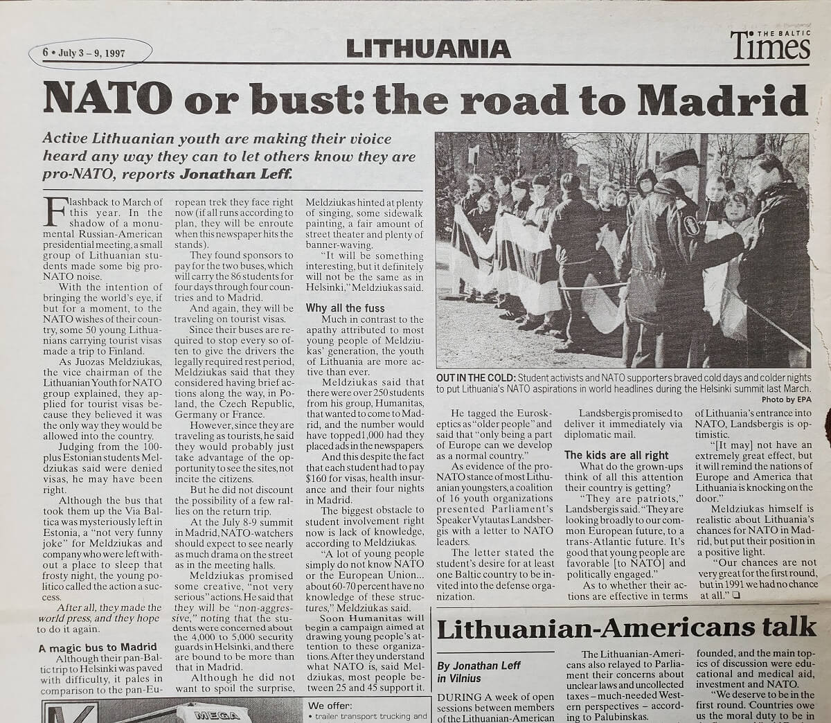 During the spring, the candidate countries met in Bratislava, Slovenia, where the Czech president Vaclav Havel advanced the agenda by singling out the Baltic states as countries that should be among the invitees at the next NATO Summit.