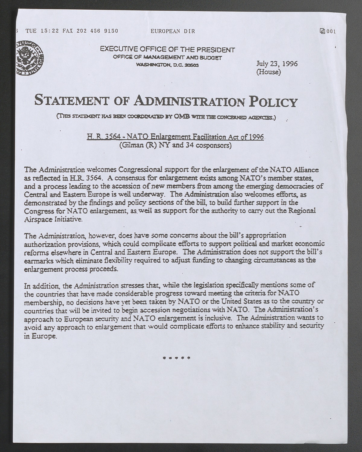 On September 30, President Clinton signed H.R. 3540 into Public Law 104-208, included amendment on NATO Enlargement Facilitation of 1996 & statement that the forcible incorporation of the Baltics into the USSR should not be a disadvantage.