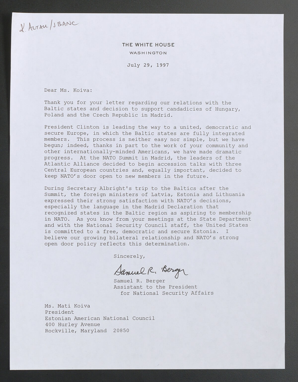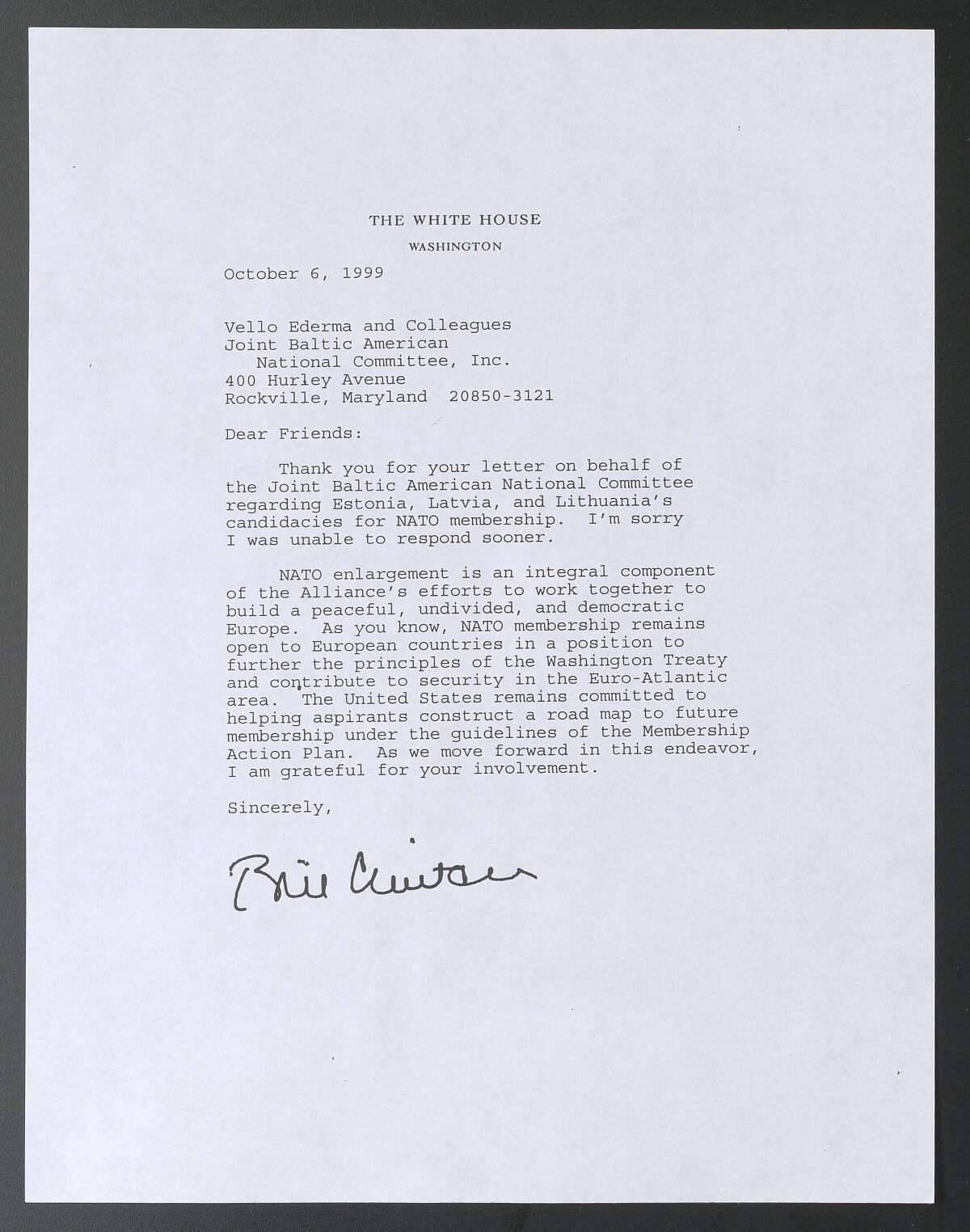 On January 16, the U.S.-Baltic Partnership Charter was signed in D.C., which committed all sides to work toward the inclusion of the Baltic states in the Euro-Atlantic institutions. Presidents Clinton, Meri, Ulmanis and Brazauskas signed the Charter. After the signing of the Charter President Clinton declared that this “furthers America’s commitment to help”.