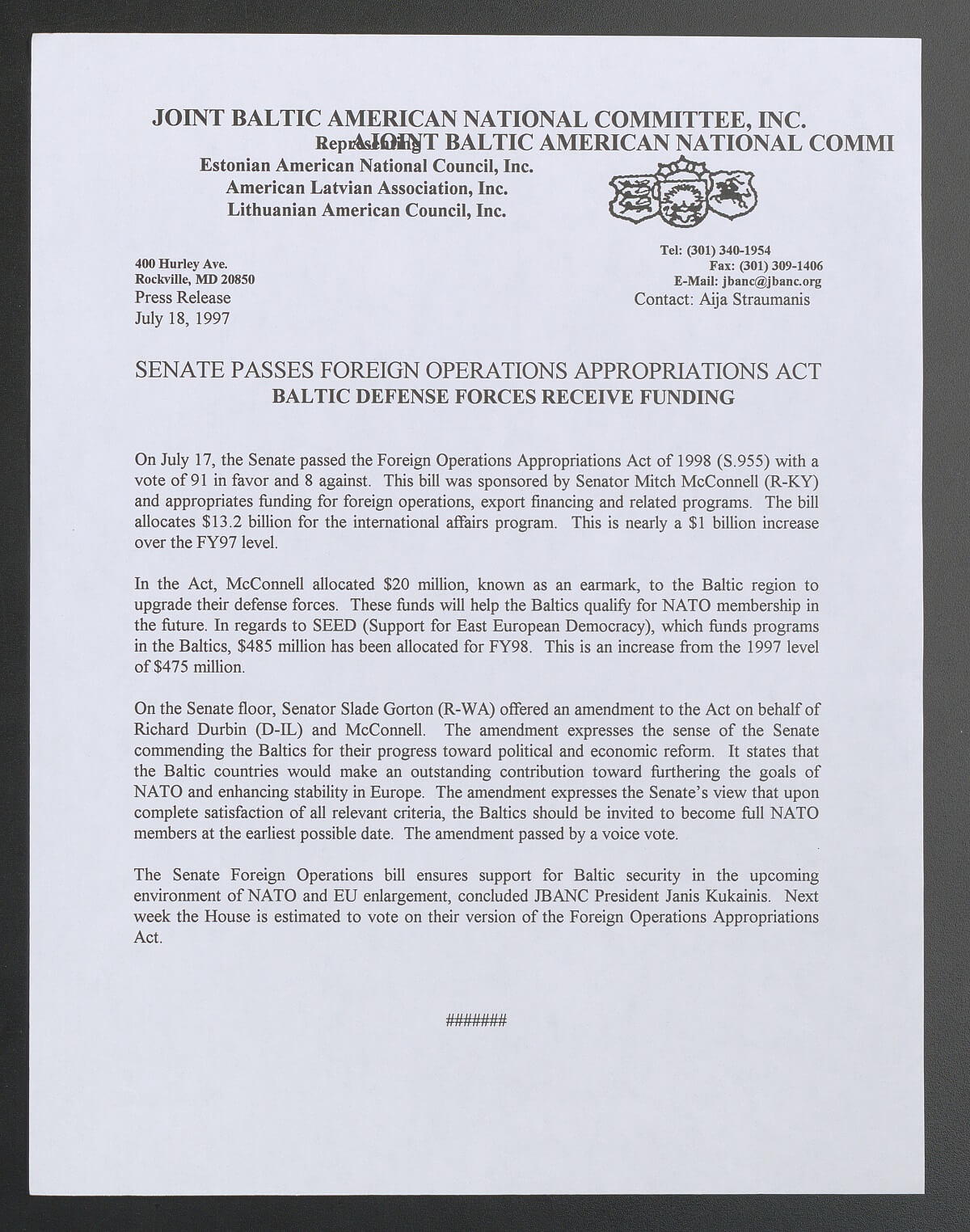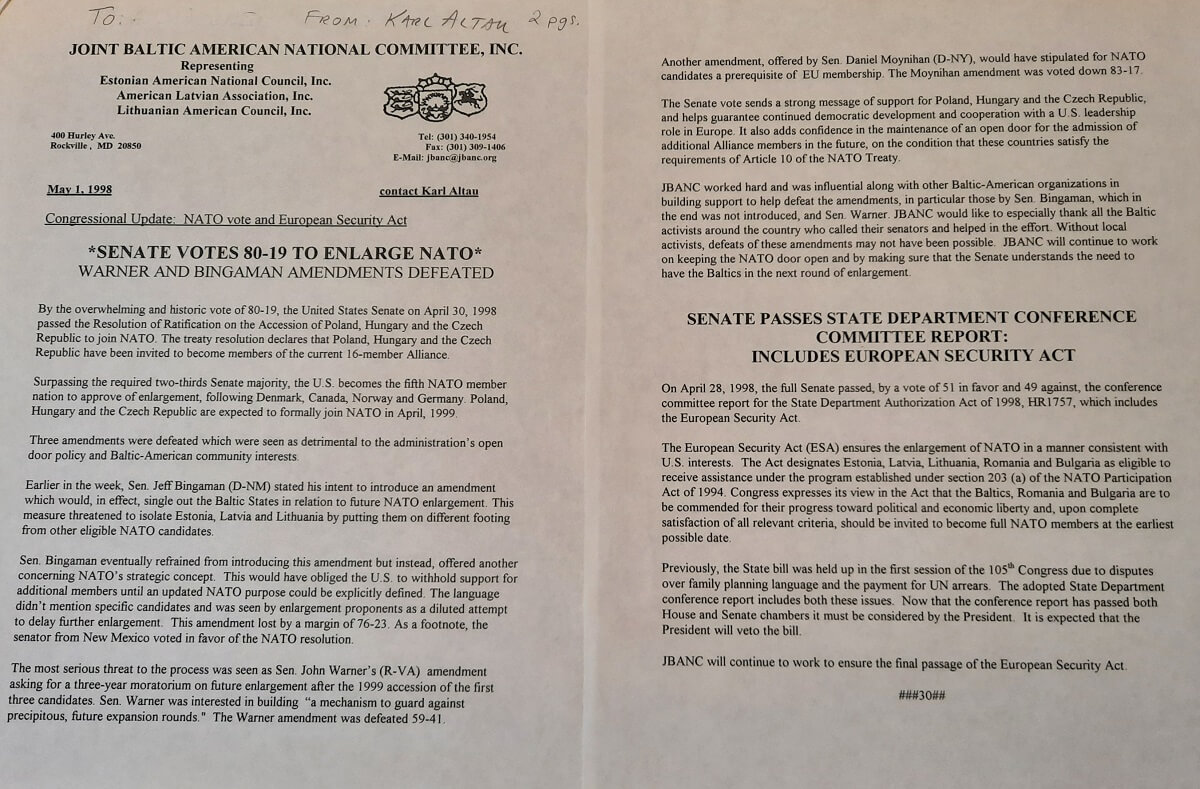 On November 5, President of the Estonian American National Council, Mati Koiva, testified on behalf of the Joint Baltic American National Committee (JBANC) at the Senate Foreign Relations Committee hearing on NATO enlargement. The Baltic American Freedom League (BAFL) submitted a policy statement to the SFRC, along with testimonies from the Lithuanian American Community and the U.S.-Baltic Foundation.