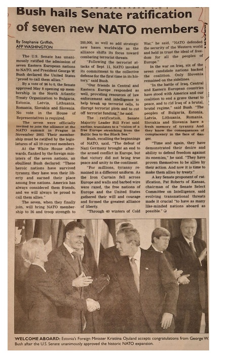 The Protocols to the North Atlantic Treaty of 1949 on the Accession of Bulgaria, Estonia, Latvia, Lithuania, Romania, Slovakia, and Slovenia were ratified on May 8, 2003 in the U.S. Senate by a vote of 96-0. With this, Estonia, Latvia, Lithuania and four other countries from Central and Eastern Europe received conclusive support from the United States to join the Alliance.