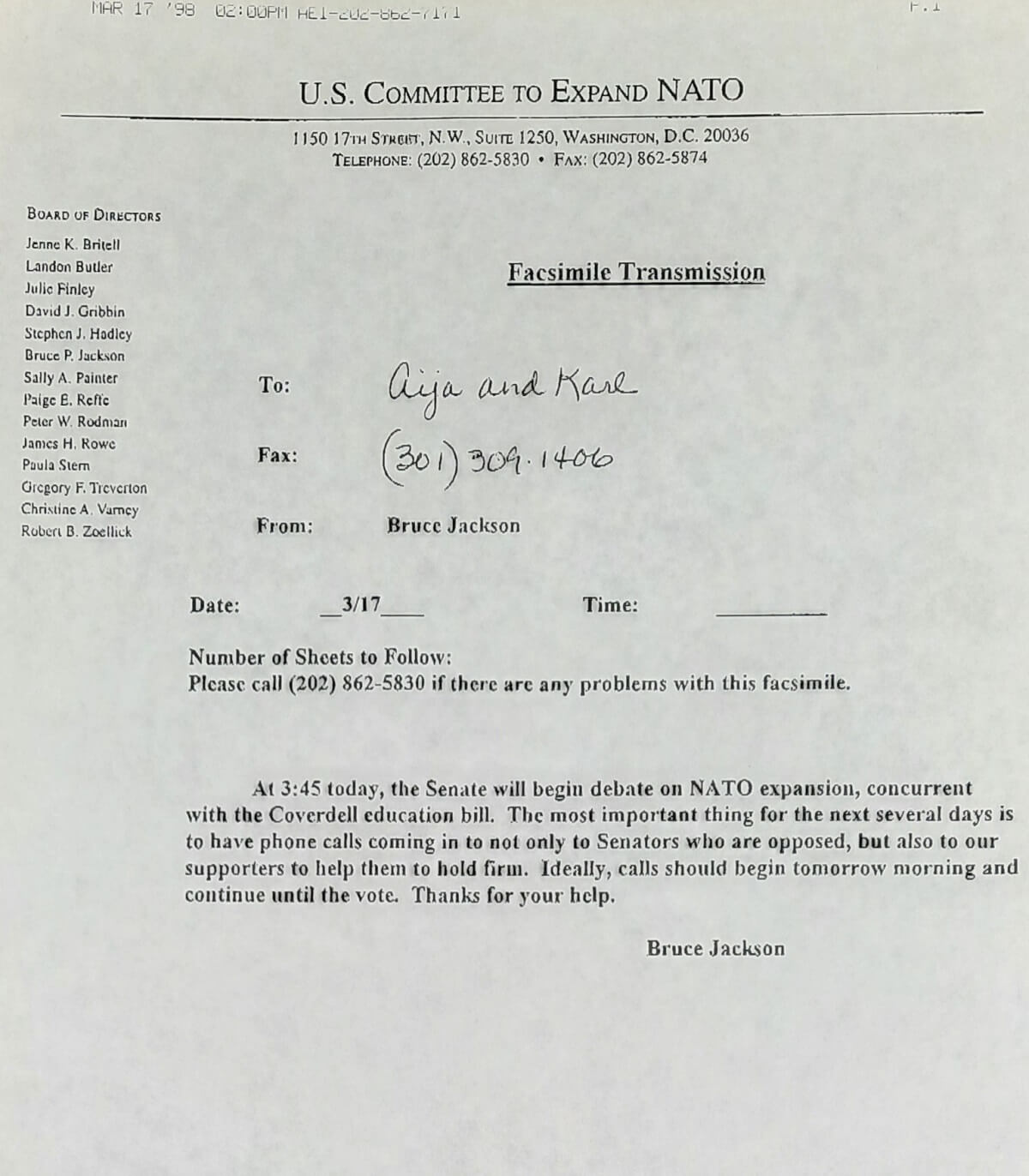 On November 1, the US Committee to Expand NATO, committed to the admission of additional European nations to NATO, incorporated as a DC-based non-profit. Goal was to seek bipartisan political/public support for NATO enlargement. Strongly believed that a united, democratic, free Europe wouldn’t need to rely on American troops.
