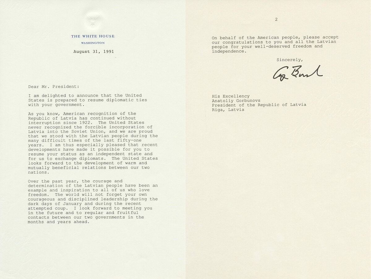 Though the United States never recognized the Soviet occupation of the Baltic countries, famously setting a standard of non-recognition via Welles Declaration issued on July 23, 1940 (which over the years helped the Baltic diplomats in their efforts to preserve legitimacy and continue to work in the interests of the Baltics), on September 2, 1991, the U.S once again formally recognized the independence of Estonia, Latvia and Lithuania.